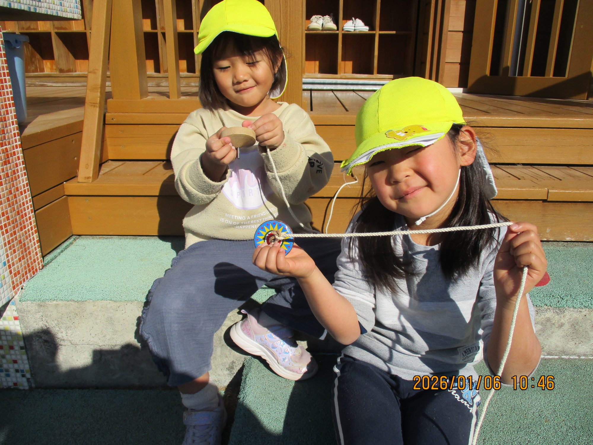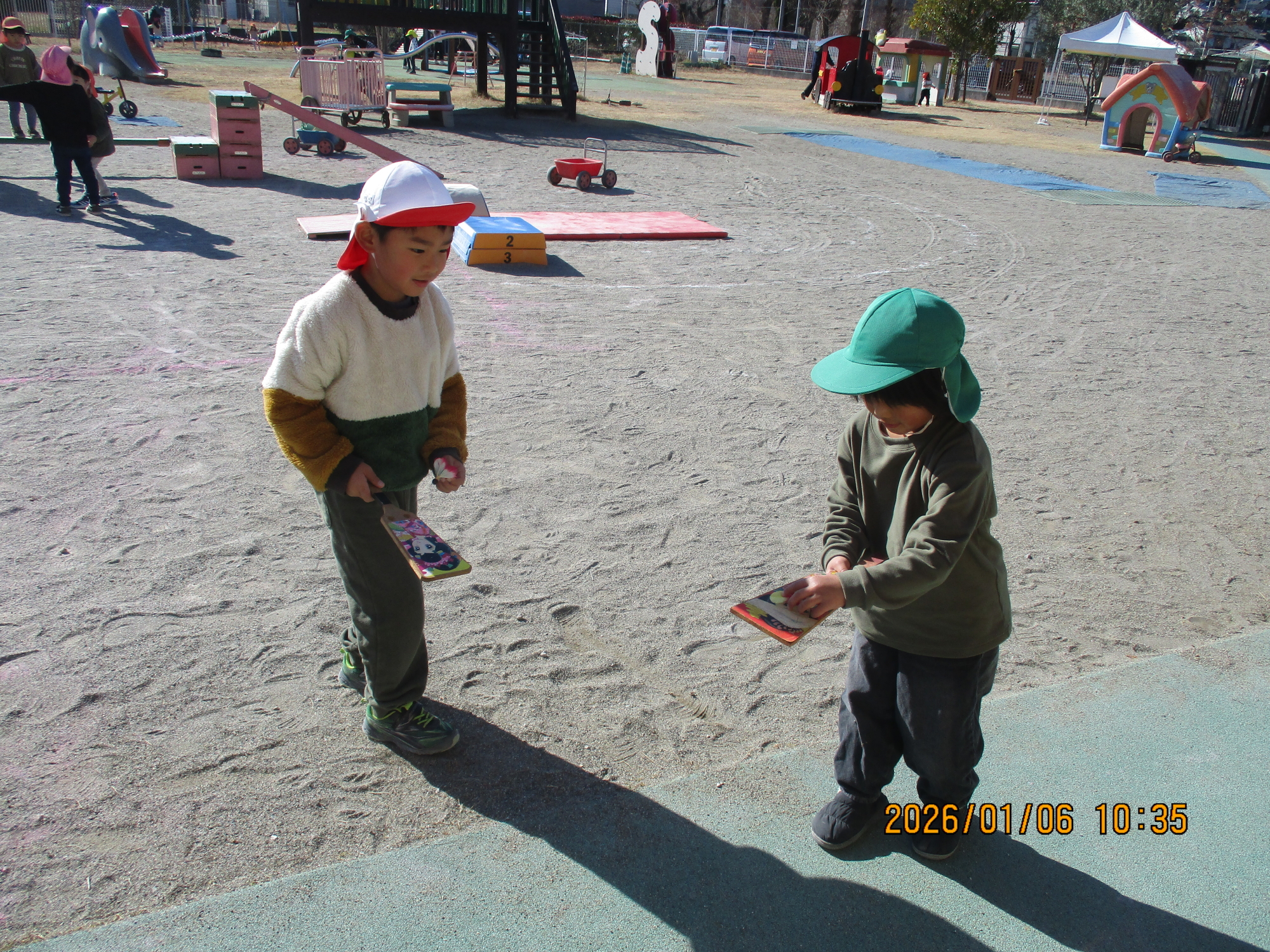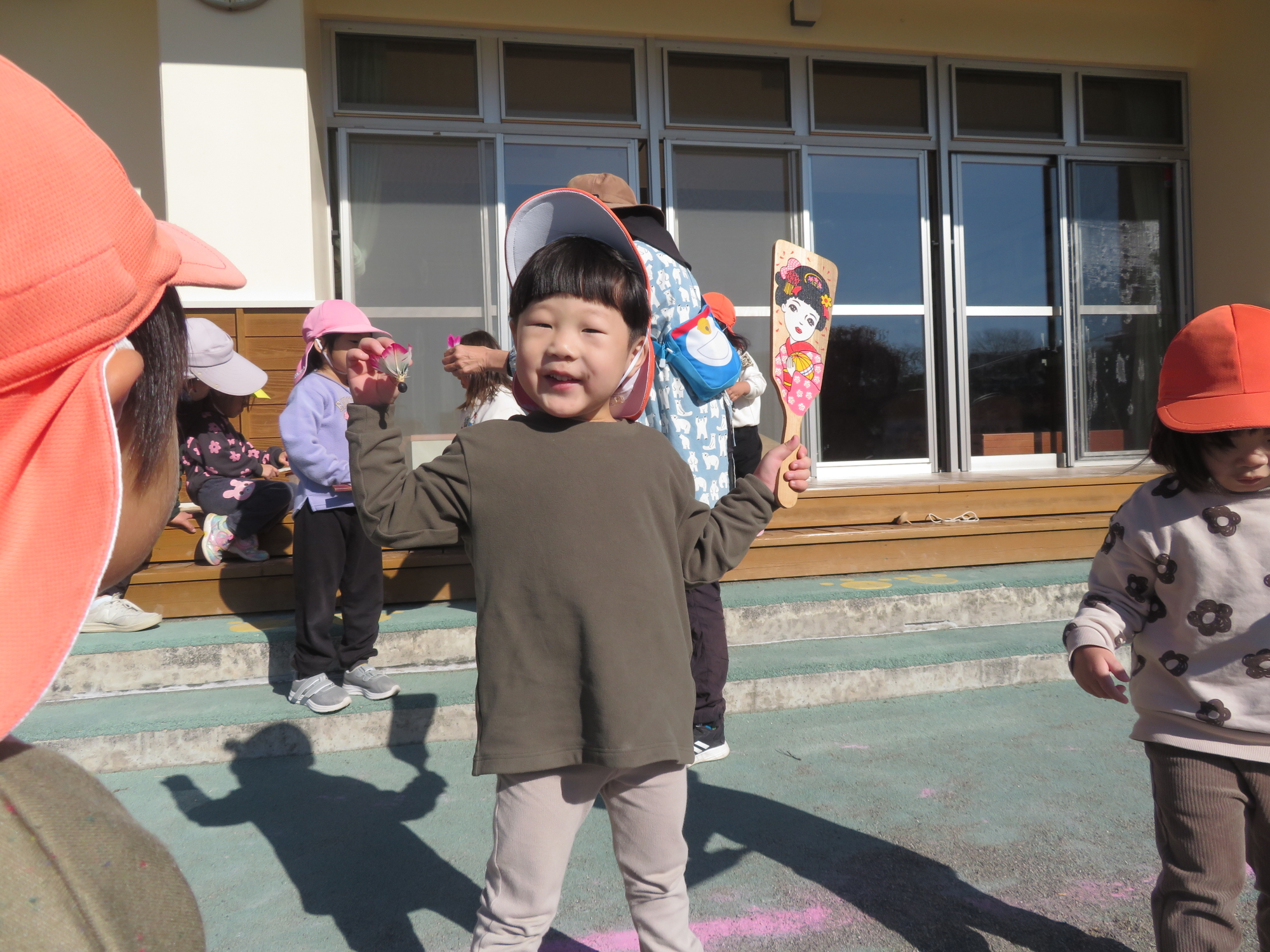 あまり触ったことのない羽子板やこまに、子どもたちは興味津々で、「これなに~?」「やってみてもいい?」と目をキラキラさせていました✨