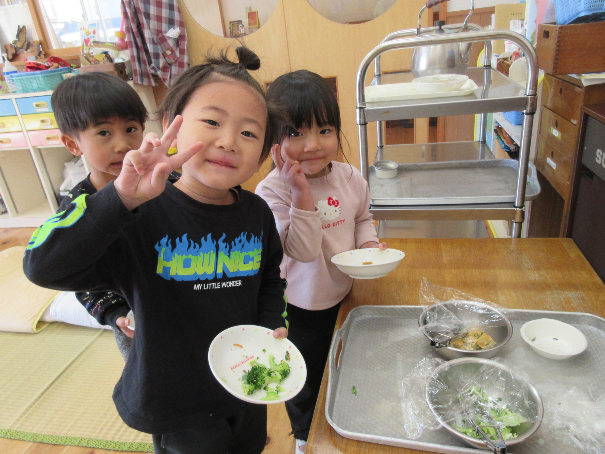 お芋が大きくて苦戦している子がいると、みどり組の子が来てくれて「やっちゃお!」と手伝ってくれていました。やっぱり頼りになるみどり組さんです♪